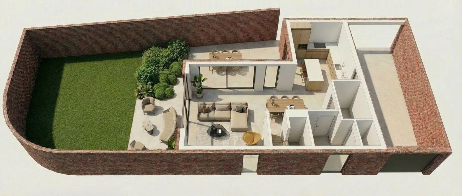 *3D tekeningen van tuin en interieur zijn een louter indicatief voorbeeld